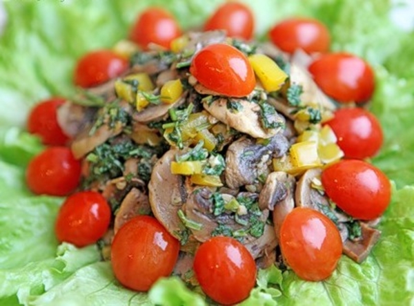 Как только грибы выпустили жидкость, добавляем перец, вливаем винный уксус и тушим 3-5 минут, постоянно помешивая. Добавляем петрушку, тушим минуты 2-3. Выкладываем на тарелку поверх салатных листьев и украшаем помидорами-черри.