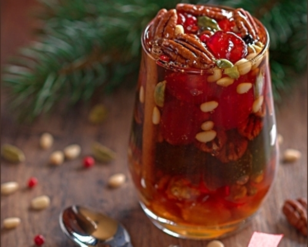 Смесь орехов предварительно слегка поджарить на сухой сковороде и остудить. Жидкий цветочный мед немного подогреть со специями, цедрой апельсина или лимона, добавить ваниль. В стаканчики разложить сухофрукты с орехами вперемешку. Залить теплым медом, накрыть и дать настояться несколько дней.