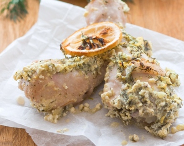 Курицу помыть, разрезать на порционные куски, выложить в форму для запекания. Лук очистить и очень мелко нарезать, но лучше пюрировать с помощью блендера. С лимона снять цедру и нарезать кружками. Укроп измельчить. В отдельной миске соединить пюре из лука, цедру и укроп, перемешать и ввести сливки. Посолить, поперчить и еще раз перемешать.