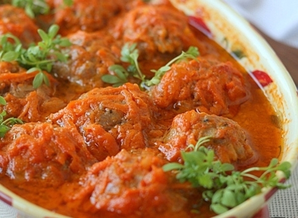 Для соуса мелко режем лук, трем на терке морковь, обжариваем на небольшом количестве растительного масла, потом добавляем немного томатного сока и тушим до мягкости. Помидоры в собственном соку измельчить в процессоре, смешать с морковью, луком и сливками. Приправить солью, перцем. Залить соусом тефтели. Накрыть крышкой или фольгой. Готовить в разогретой до 200С духовке примерно 30 минут.