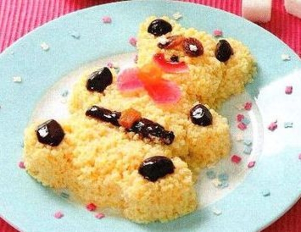 Из молока, пшена, соли и сахара сварить пшенную кашу, заправить ее сливочным маслом. Выложить на тарелку и сформировать силуэт медведя. Шоколад растопить на водяной бане с добавлением молока. Украсить мишку по желанию изюмом, шоколадом, цукатами, дольками фруктов, мармеладом.