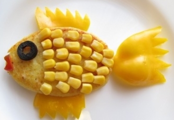 Формируем небольшие котлеты, в сковороде разогреваем растительное масло и обжариваем до золотистой корочки. Готовые рыбные котлеты с кукурузой можно украсить в виде Золотой рыбки. Чешую выкладываем из кукурузы, глазик из оливки, а хвост и плавники из жёлтого перца.