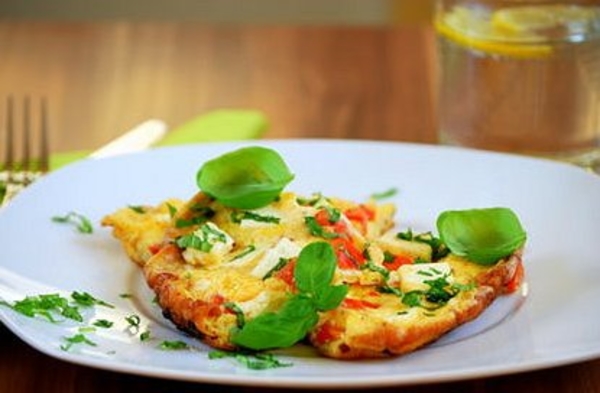 Помидоры помыть, разрезать пополам и удалить семена. Нарезать на мелкие кусочки. Сыр фета порезать кубиками примерно 1 см. Яйца смешать с солью, перцем, паприкой и минеральной водой.