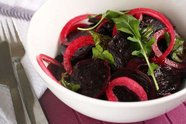 Вымой и свари некрупную свеклу. Готовую свеклу остуди, очисти и нарежь ломтиками толщиной 3-5 мм. Сладкий лук очисти, нарежь тонкими кольцами и добавь к свекле.