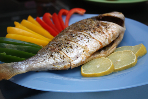 На каждой рыбине сделать неглубокие надрезы, посолить, поперчить, сбрызнуть оливковым маслом. Запекать 25 минут на решетке при температуре 200 градусов. Готовую рыбу сбрызнуть лимонным соком и подавать с овощами.
