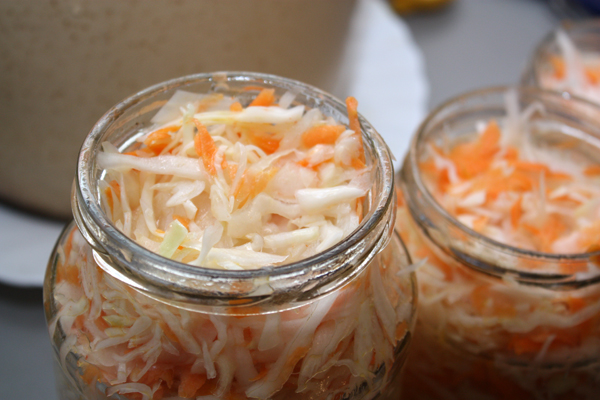 Готовую капусту осталось только разложить по банкам и убрать в холодильник.