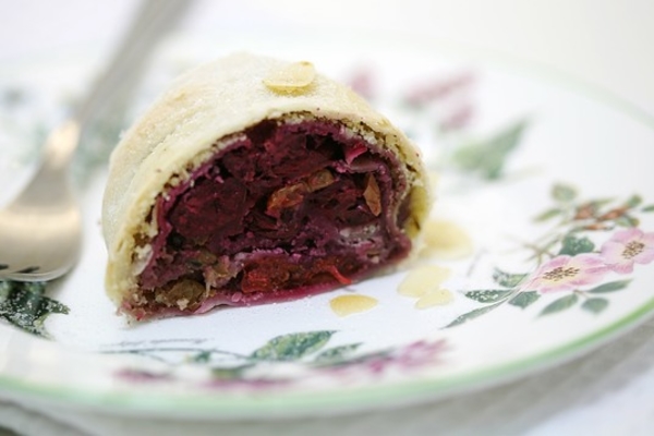 Растяни тесто до размеров полотенца. Этого количества хватит ровно на размер полотенца. На тесто насыпь 100 г молотого миндаля, затем изюм, отжатую вишню, немного миндальных листочков для хруста, посыпь небольшим количеством корицы и двумя столовыми ложками (50 г) сахарного песка. Важно, что начинка не должна доходить до боковых краев на несколько сантиметров, а кусок теста на последний виток тоже надо оставить свободным.