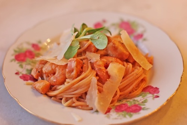 На оливковом масле обжариваем морепродукты с веточкой розмарина 5 минут. Вливаем сливки, затем вино. Добавляем томатную пасту, измельченный чеснок и тушим соус 3 минуты. Соус смешать со спагетти и сразу подавать на стол, посыпав сыром.