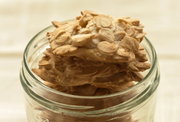 Белки с щепоткой соли взбить в крутую пену, и, продолжая взбивать, всыпать сахарную пудру . Добавить миндальные лепестки и хорошо перемешать.
