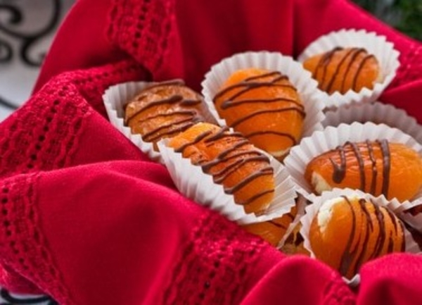 Затем взбить миксером в пышную массу, выложить в кондитерский мешочек и отрезать уголок. Абрикосы надрезать сбоку, открыть как книжку и наполнить шоколадной массой. Поставить в холодильник застывать на 10 минут.
