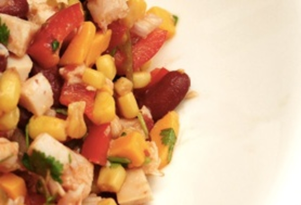 Быстро поджарить куриное филе (не пересушить). Порезать кубиками куриное филе, сладкий перец, сыр. Тонко нашинковать лук.