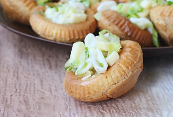 Яблоки очистить, порезать кубиками, салат - тонкой соломкой поперек. Все перемешать, заправить домашним майонезом, посолить и поперчить, дать настояться. Заполнить тарталетки салатом.