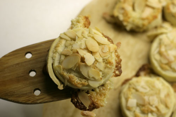 Тесто тонко раскатать на посыпанной мукой поверхности и намазать миндальной массой. Свернуть рулетом. Лишнюю муку стряхнуть кисточкой. Срезать неровные края. Нарезать рулет кусочками, укладывая их на пекарскую бумагу. Печь около 25 минут при 200 С. Через 15 минут после начала приготовления посыпать миндальными листочками.