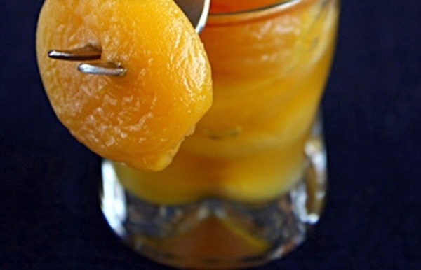 В сотейнике абрикосы залить вином, апельсиновым соком и добавить немного сахара. Слегка отварить, снять с огня и оставить на сутки.