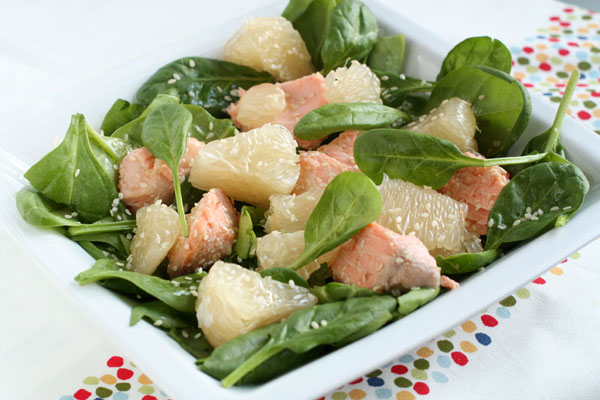 На тарелках разложить смесь зелени с заправкой, сверху выложить рыбу и помело. Для украшения можно посыпать мелко нарезанной кинзой или кунжутом.