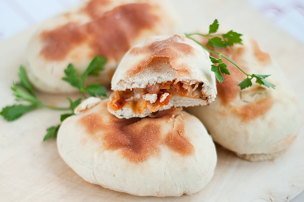 Из готового теста слепить шарики, расплющить (слой теста не должен быть слишком тонким, чтобы пирожки не получились сухими), выложить начинку, защепить по краям, уложить на смазанный маслом (или накрытый бумагой для выпечки) противень швом вниз.