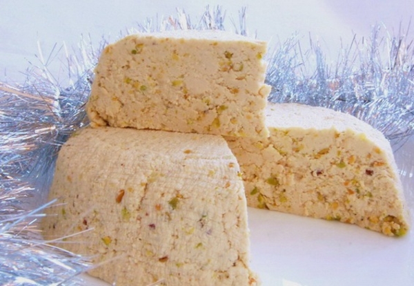 Прямо в марле ненадолго отвесить, чтобы стекла лишняя жидкость. Заправить панир пряными травами, перцем, колотыми фисташками, перемешать, плотно завернуть, положить в форму, сверху положить гнет. Убрать в холодильник на ночь.