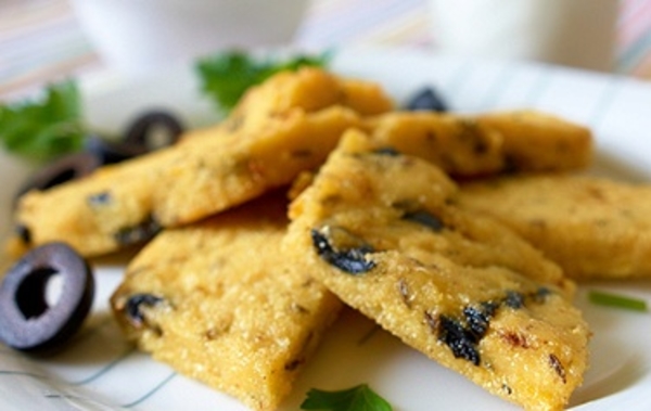Выложить готовую поленту на промасленный пергамент, разровнять ножом или лопаточкой, охладить. Порезать на квадраты со стороной 5 см, обжарить на сковороде в разогретом оливковом масле с двух сторон до золотистой корочки.