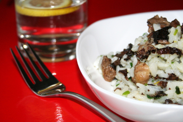 Пока рис варится, разогреть на сковороде оставшееся сливочное масло, добавить к нему оливковое, перемешать и положить мелконарубленный лук. Жарить лук на небольшом огне 2 минуты. Добавить грибы, посолить, поперчить. Обжаривать на среднем огне 5 минут. Посыпать грибы лимонной цедрой. Перемешать и снять с огня.