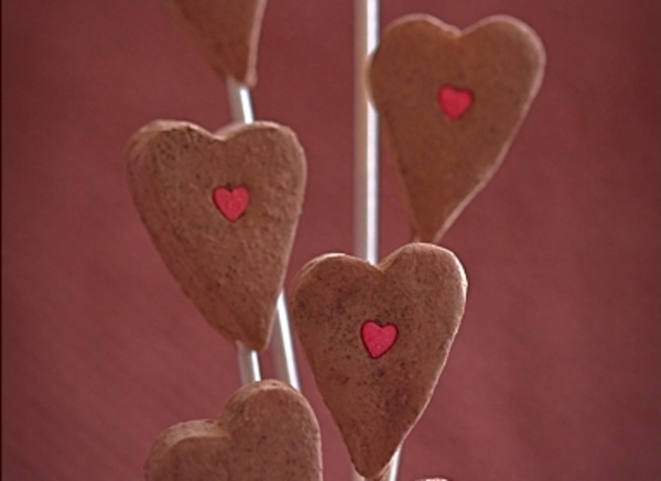 Раскатать марципан толщиной 1 см, вырезать формочкой сердечки. Обвалять сердечки в просеянном какао-порошке. Украсить сахарной кондитерской посыпкой.