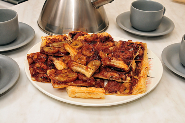 Смешать сахар с корицей. Порезать бананы и выложить сверху. Поставить в духовку, предварительно разогретую до 180 градусов на 15 минут.