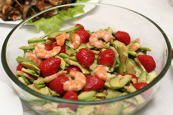 Смешать уксус, оливковое масло, сахар. Соль и перец добавить по вкусу. Смешать клубнику, креветки и авокадо и заправить соусом.