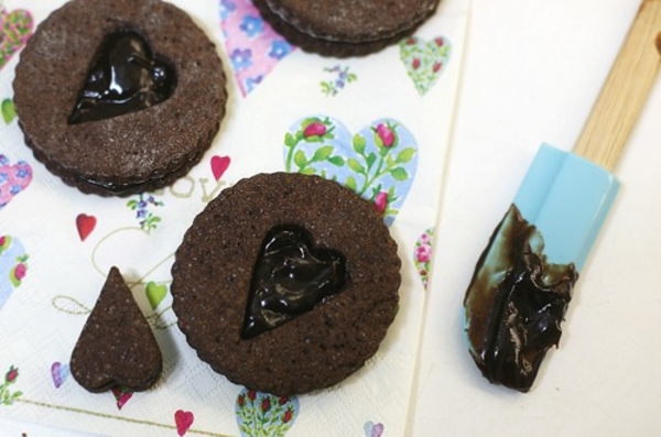 Присыпать стол мукой. Положить тесто и расплющить.Раскатать до толщины 2 мм и вырезать кружочки, в половине которых вырезать отверстия маленькой формочкой. Выпекать 12 минут при 200 С, остудить на решетке.