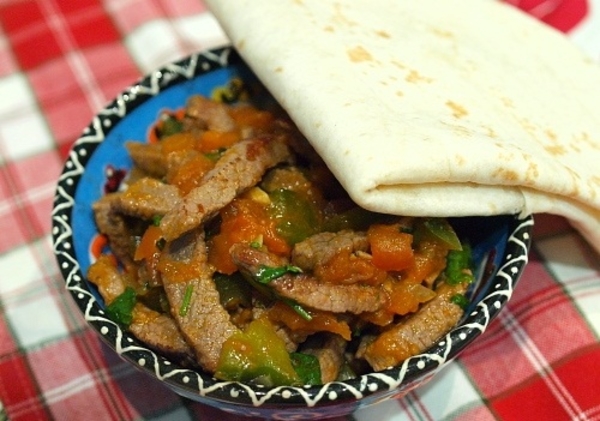 Затем добавить мясо, полить соком лайма, приправить солью и чили и прогревать содержимое еще 5 минут, помешивая. Готовое мясо посыпать рубленой кинзой и подать с теплыми лепешками.