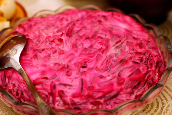 На дно блюда выложить картофель, разровнять, смазать майонезом. Затем выложить ингредиенты в такой последовательности: сельдь, майонез, лук, морковь, майонез, свекла. Каждый слой нужно смазать майонезом.