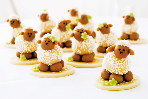 3 Сформируй из светлой массы крупные шарики. Обкатай их в кокосовой стружке. Из коричневой массы скатай шарики размером поменьше. Сформируй из шариков овечек, как показано на фото. Усади их на печенья.