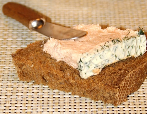 Оставшееся размягченное сливочное масло смешать с измельченной зеленью укропа.Когда паштет хорошо охладится, поперчить его и смазать укропным маслом, снова охладить.