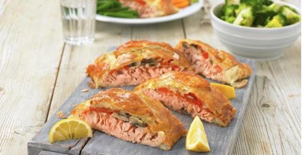 Грибы режем тонкими ломтиками и быстро обжариваем до легкой румяности. Помидор режем тонкими кружочками. Слоеное тесто размораживаем, раскатываем до такого размера, чтобы лосось поместился целиком. Филе рыбы выкладываем на тесто и смазываем маслом с лимонной цедрой и травами. Сверху выкладываем обжаренные грибы, на них помидоры.