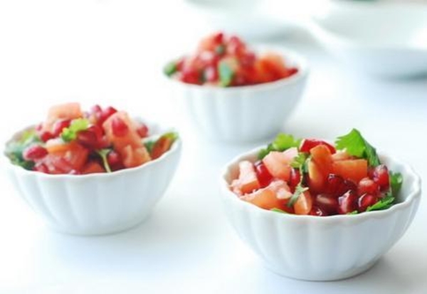 Порезать кубиками помидоры и нарезать лук. Очистить гранат и разобрать на зерна. В большой чаше смешать помидоры с зернами граната и зеленью.