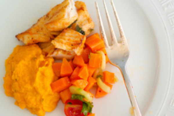 Все перемешать, посолить и выжать сок половины лимона. Оставить  мариноваться на час. Рыбу обжарить на разогретой сковороде до готовности на небольшом количестве оливкового масла буквально три-пять минут. Не пересушить.