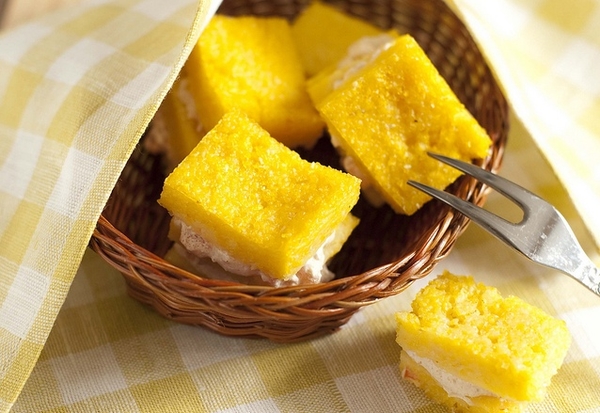 Поленту разрезаем пополам и одну половину смазываем начинкой. Накрываем плотно второй половиной и разрезаем на квадратики. Сбрызгиваем оливковым маслом, посыпаем базиликом, помещаем в духовку при 200С на 10-15 минут. Подаем горячей.