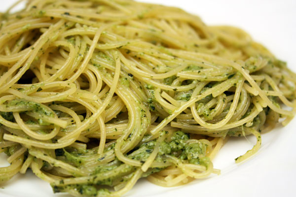 Добавляем листики базилика, измельчаем все вместе до консистенции густого соуса. Очень хорошо сочетается соус с горячей пастой. В данном случае со спагетти, отваренными в большом количестве подсоленной воды.