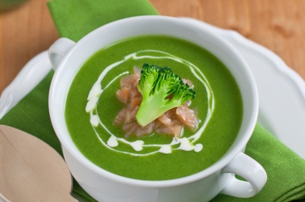 Брокколи разобрать на мелкие соцветия. Положить в бульон, дать закипеть и варить 10 минут, затем пюрировать. Посолить, поперчить по вкусу.