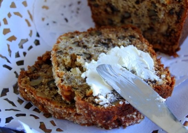 В миске поменьше слегка перемешать яйца, добавить размятые бананы, масло, ликер и хорошо перемешать. Соединить все ингредиенты и быстро перемешать до однородной массы. Добавить орехи и еще раз перемешать.