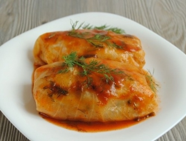 В небольшом количестве воды, в которой варилась капуста, растворить томатную пасту и немного соли, залить голубцы так, чтобы жидкость слегка их прикрыла. Посыпать рубленым укропом, добавить лавровый лист, довести до кипения, накрыть крышкой и готовить на маленьком огне 20-25 минут.