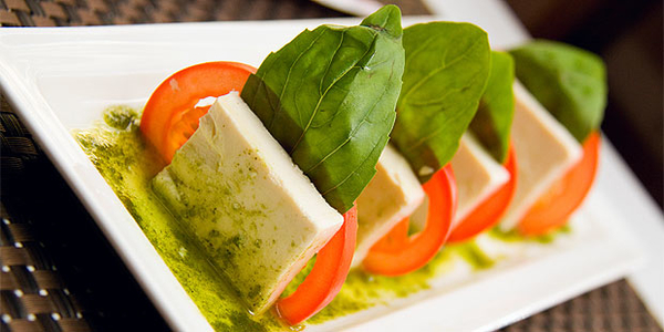 Тофу и помидоры нарезать ломтиками толщиной 0,7-1 см. В центр плоской тарелки налить полосу соуса из базилика, на соус установить ломтики помидора и тофу, чередуя с листиками базилика. Постную закуску из тофу посыпать солью и перцем, оформить зеленым маслом.