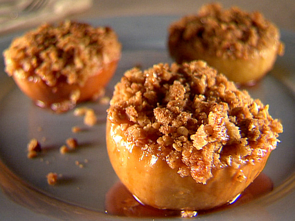 Размять бананы и хорошо перемешать с орехами и ванильным сахаром. Этой массой наполнить яблоки. Ложку начинки оставить для украшения. Полить яблоки сиропом и поставить запекаться в духовку.