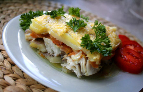 Картофель почистить, помыть и нарезать кружками. Половину картофеля выложить на противень, немного посолить и поперчить. На картофель выкладываем всю рыбу. Помидоры нарезаем кружками и выкладываем на рыбу, немного солим и перчим.