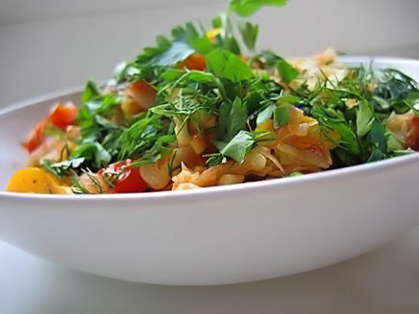 Все тщательно перемешать, сверху обильно посыпать листьями петрушки и веточками укропа. Витаминный салат из капусты готов!