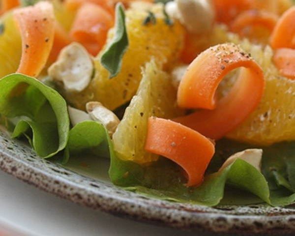 Смешать масло, лимонный и апельсиновый сок в маленькой миске. Приправить солью и перцем, можно добавить немного сахара. Перемешать апельсины с морковью заправить салат. Посыпать орехами и подавать.