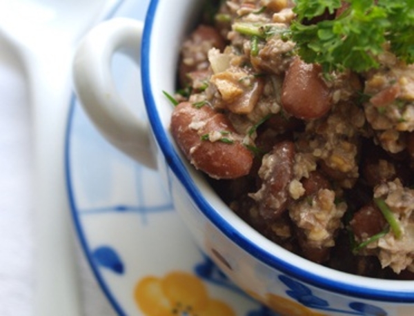 Лук и чеснок очистить, пропустить вместе с грецкими орехами через мясорубку. Кинзу вымыть, обсушить и измельчить. Смешать фасоль, ореховую пасту и кинзу, посолить, поперчить по вкусу. Если лобио получилось очень густым, добавить несколько ложек отвара из фасоли.