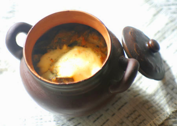 Тушить еще 5 минут под крышкой. Теперь выкладываем все в горшочки. Первый слой – половина печени, второй слой – картофель, третий – оставшаяся печень. Посыпаем все сыром и отправляем горшочки в разогретую до 180 градусов духовку на 30 минут.