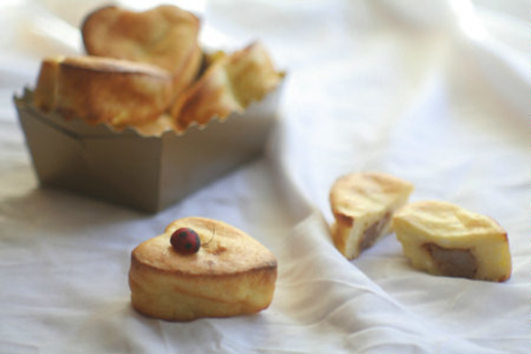 Тесто должно напоминать густую сметану. Форму смазываем сливочным или растительным маслом и выкладываем по одной столовой ложке теста. Теперь кладем одну десертную ложечку сгущенки или любой сухофрукт.