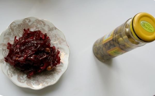 Отвариваем буряк. Нарезаем его на терке крупной. Даллее, в него добавляем тертый соленый огурец и каперсы из банки (на фото).