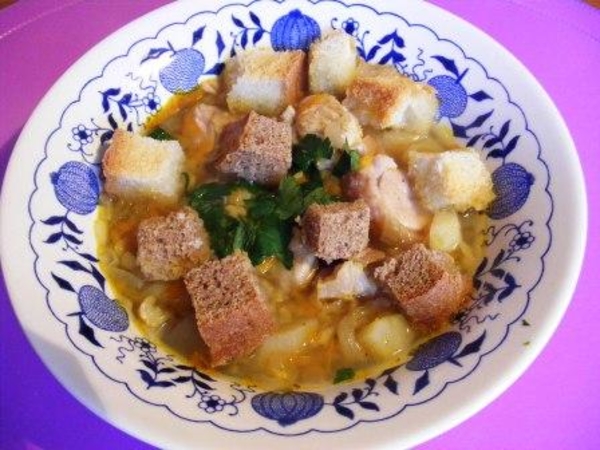 Когда горох станет мягким, добавляем соль, перец черный и красный, шафран, кориандр молотый, орегано, кумин, лавровый лист. Выпекаем в духовке сухарики и добавляем к готовому супу в тарелку, присыпать зеленью петрушки.