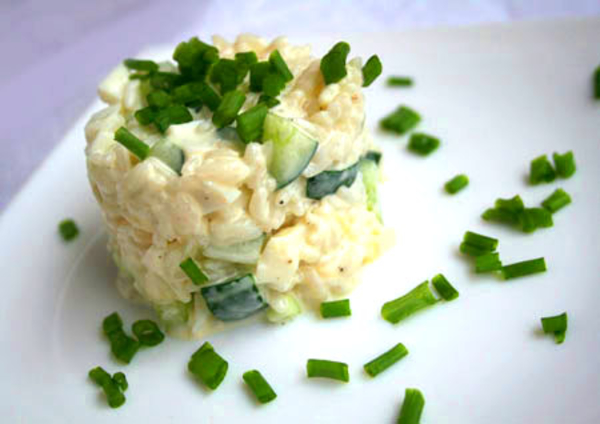 Все перемешиваем, добавляем охлажденный рис и заправляем майонезом. Солим, перчим и отправляем салат в холодильник минут на 15.